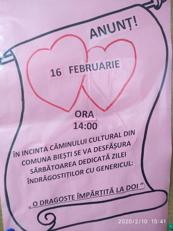 Dragi consăteni și oaspeți ai comunei Biesti, cu prilejul Sărbătorilor consacrate Zilei Îndrăgostiților și Dragobete, Primăria Biesti  organizeaza un eveniment cultural.