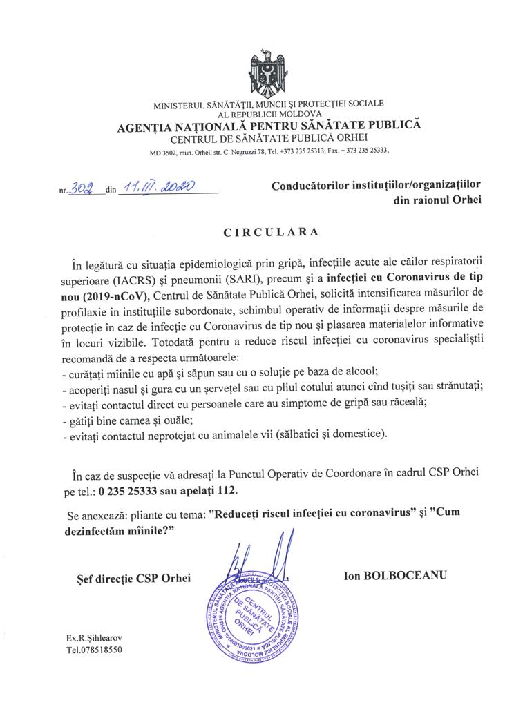 Circulara nr.302 din 11.03.2020 Conducătorilor instituțiilor/organizațiilor din raionul Orhei