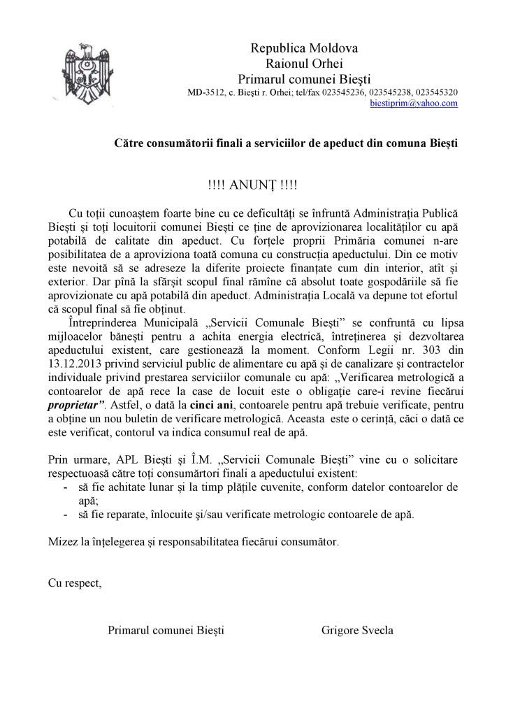 Către consumătorii finali a serviciilor de apeduct din comuna Biești